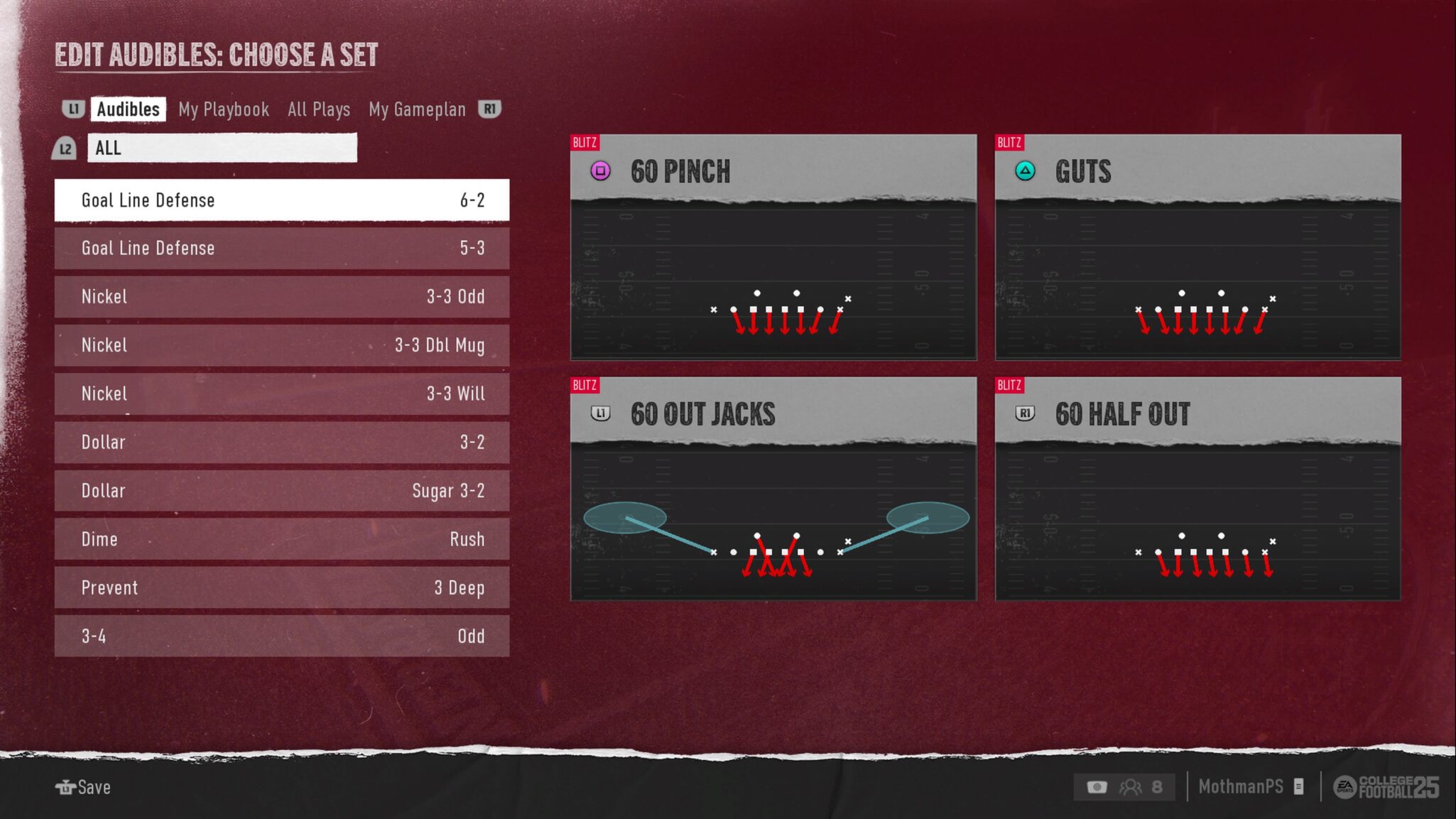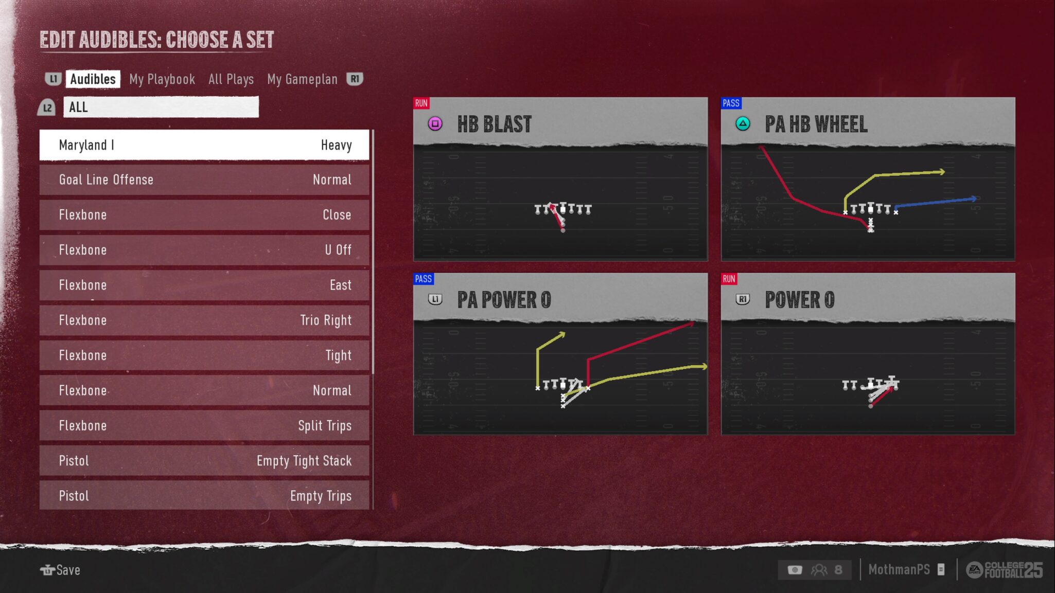 In there, you can go through the different plays for each section. Audibles are, of course, the plays you can call on the fly after breaking the huddle. My Playbook lets you see the formations and plays within your College Football 25 custom playbook.