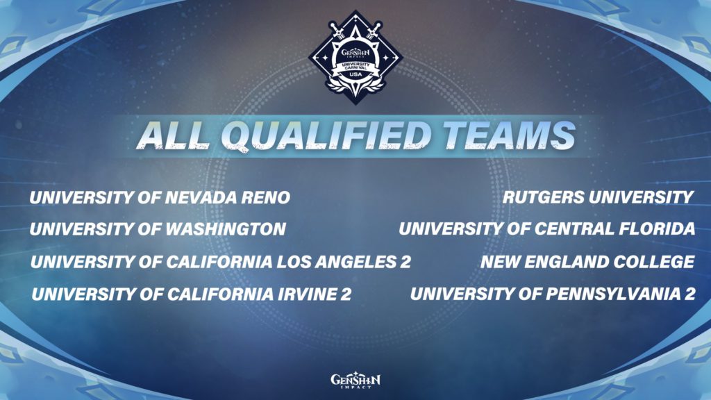 Moreover, if you want to learn about their journey, you should check out our Genshin Impact University Carnival USA qualifiers recaps that happened on October 15th and 16th. Furthermore, we have made a profile about each team, you can access them by clicking their name in the list above.