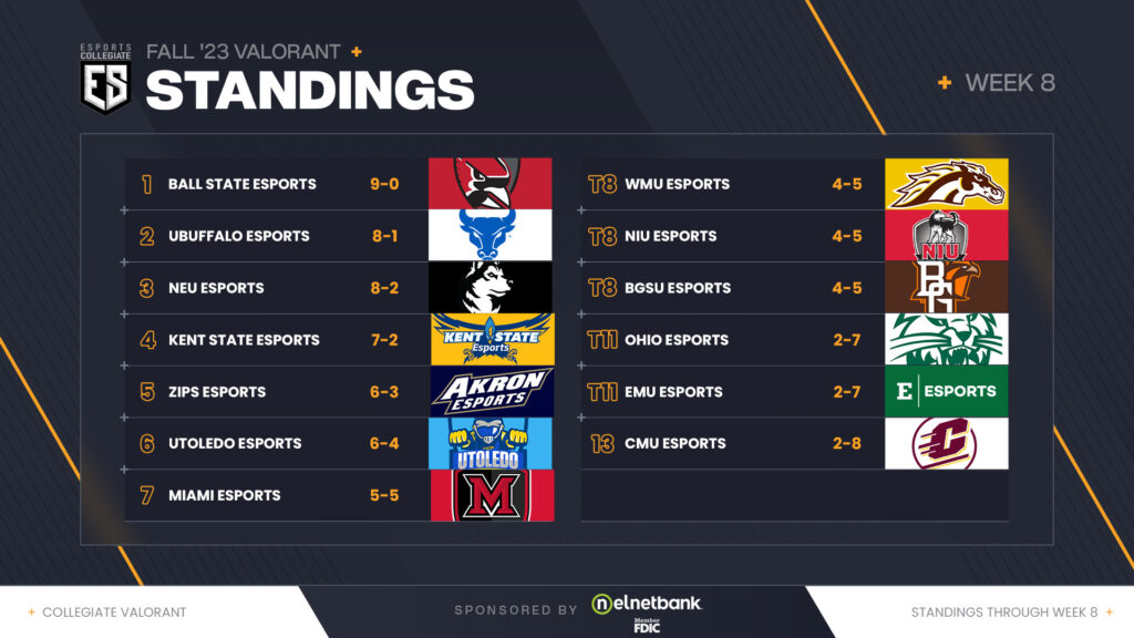 Starting the week off for VALORANT, the Miami RedHawks (5-5) face off against the Buffalo Bulls (8-1) in a potentially playoff-defining match. With a win, Buffalo secured their postseason bid for another year in a row, giving them a chance at repeating another ESC championship. If Buffalo is able to win both matches this week against Miami and Northern Illinois, then it sets up a potential battle for the first seed against Ball State in Week 10.
