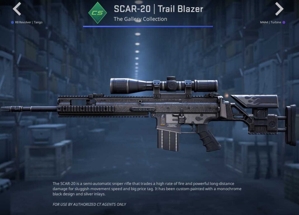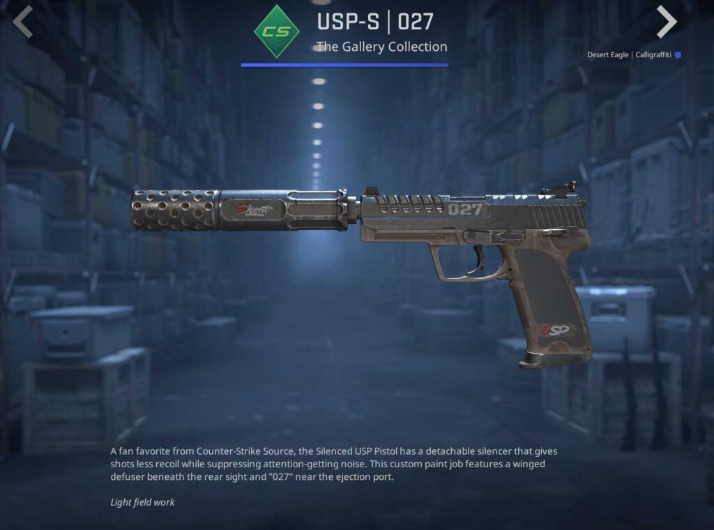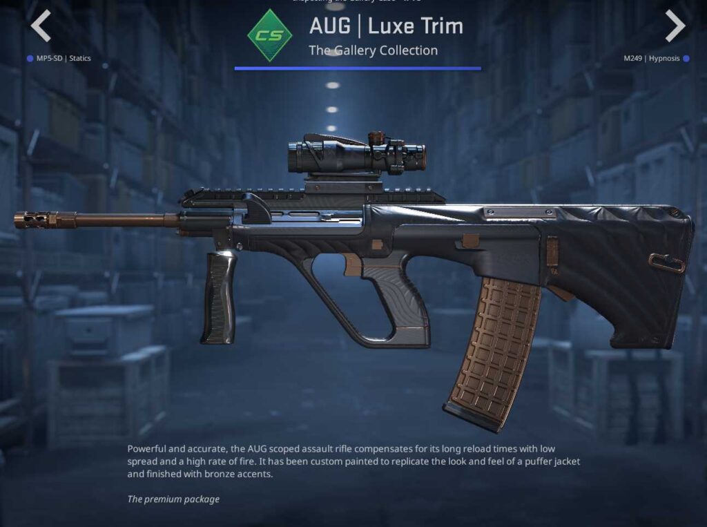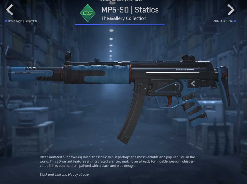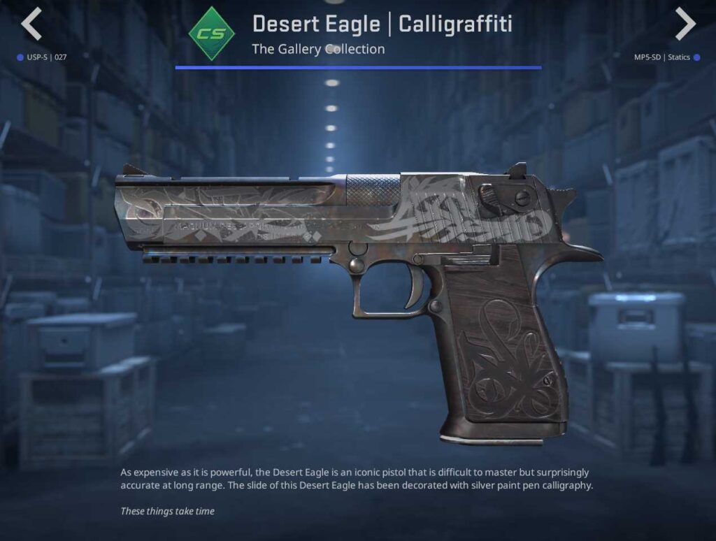 Seven skins make up the base tier of the CS2 Gallery Case, but it is the pistols that draw attention. The M249, MP5-SD, AUG, and Scar-20 all feature simple designs with minimal detailing. The Desert Eagle Calligraffiti, meanwhile, combines graffiti with wooden detailing, making it a solid dark-themed skin.