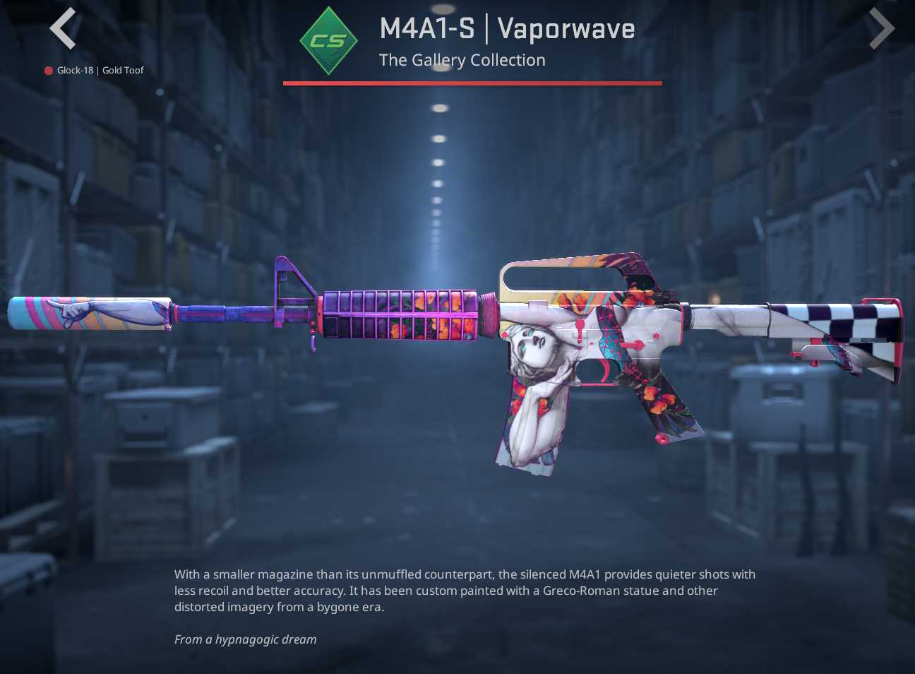 The Gallery Case’s covert tier includes two skins, with the M4A1-S Vaporwave stealing the spotlight. This rifle skin features vivid shades of pink, purple, and teal, blending street and pop art into a striking, abstract aesthetic. Its highlight is artist, Blazer’s creative take on Michelangelo’s marble sculpture.