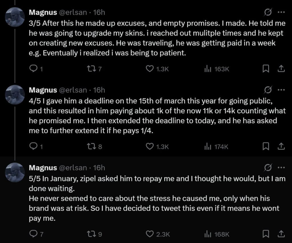 After threatening to go public, he paid erlsan USD$1,000. A prominent name in the Counter-Strike skin community, Oliver "zipeL" Behrensdorff was also mentioned.