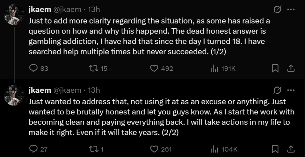 About an hour after erlsan's post, jkaem took to his own X to acknowledge the allegations and claim accountability.