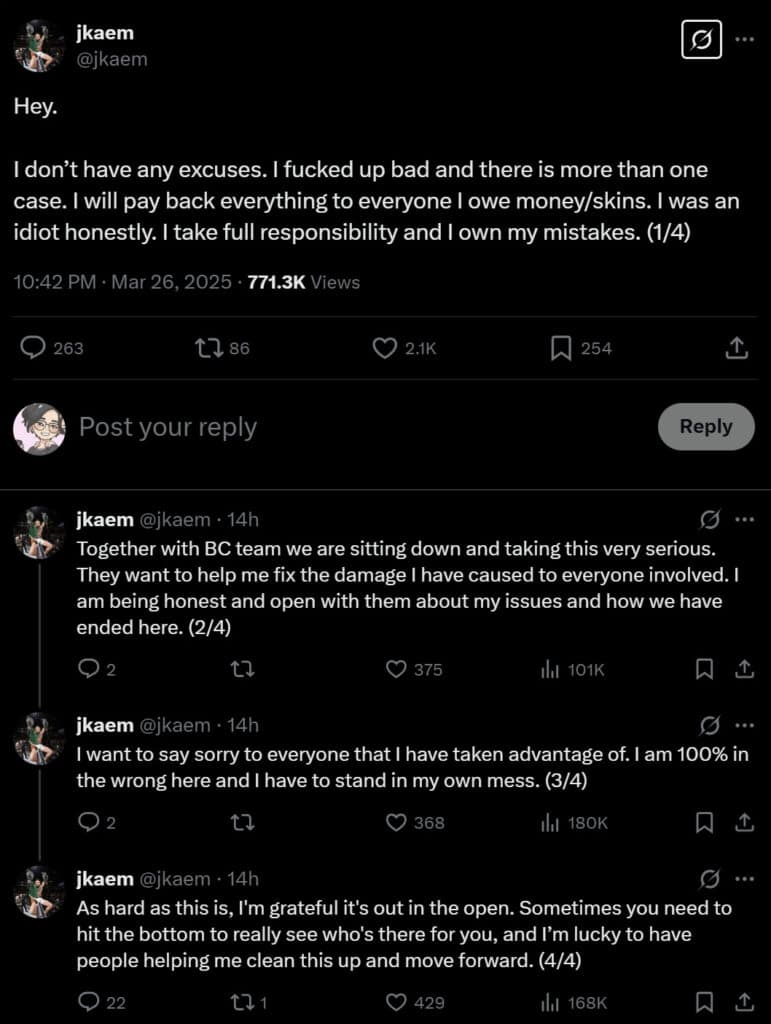 Counter-Strike 2 professional player Joakim "jkaem" Myrbostad admitted his fault and vowed to repay the owed skins after a thread on X exposed him. Read about the jkaem incident, and his response, here.