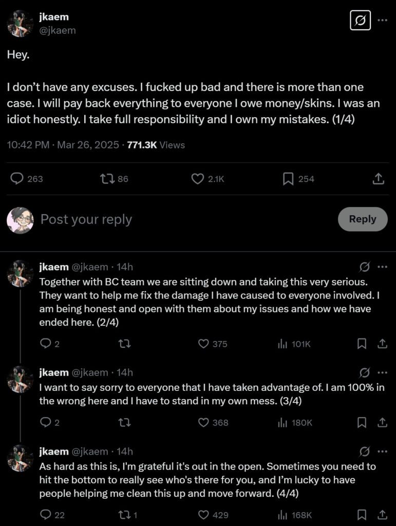About an hour after erlsan’s post, jkaem took to his own X to acknowledge the allegations and claim accountability.