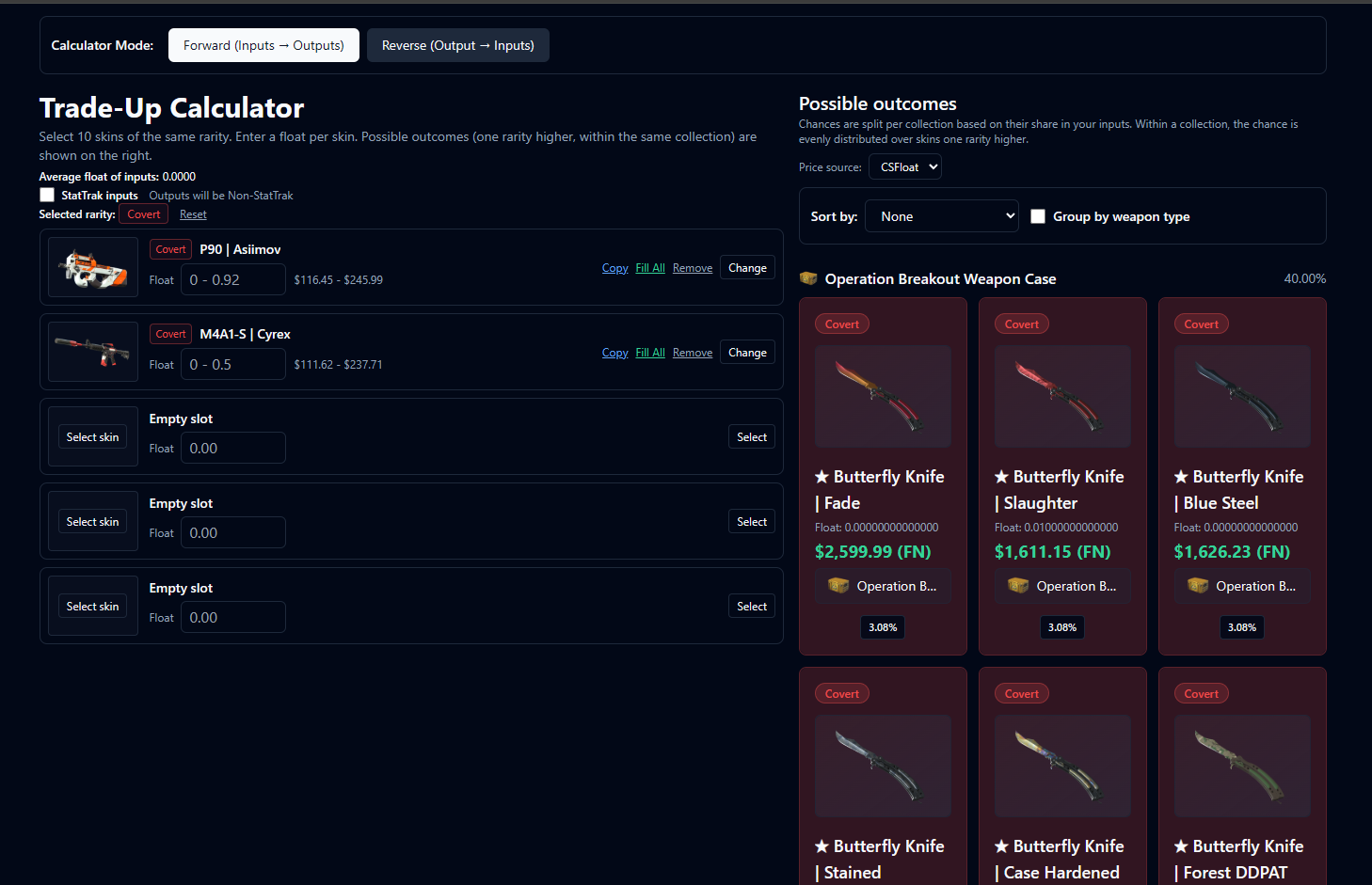 This site allows you to enter skins that you want to trade up. Select your skins, input their float values, and it will show you what CS2 skins you can get by trading them up.
