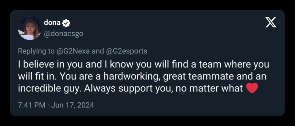 No more good vibes… jokes aside on the bench as of today in @G2esports. Thank you for the last 6 months, it was a pleasure to be here again. With that being said I’m still eager and ready to play the next season and open to offers in any role.