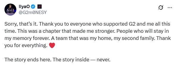 “Sorry, that’s it. Thank you to everyone who supported G2 and me all this time. This was a chapter that made me stronger,” said m0NESY on Twitter.