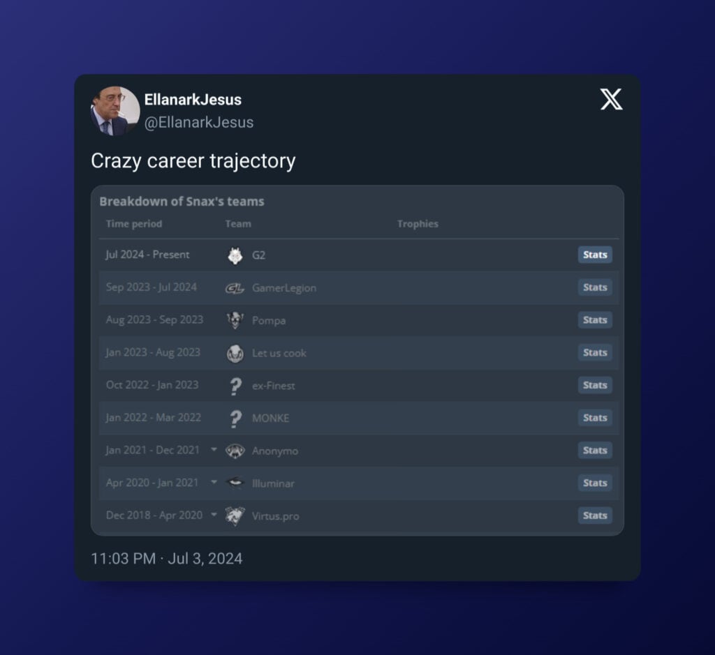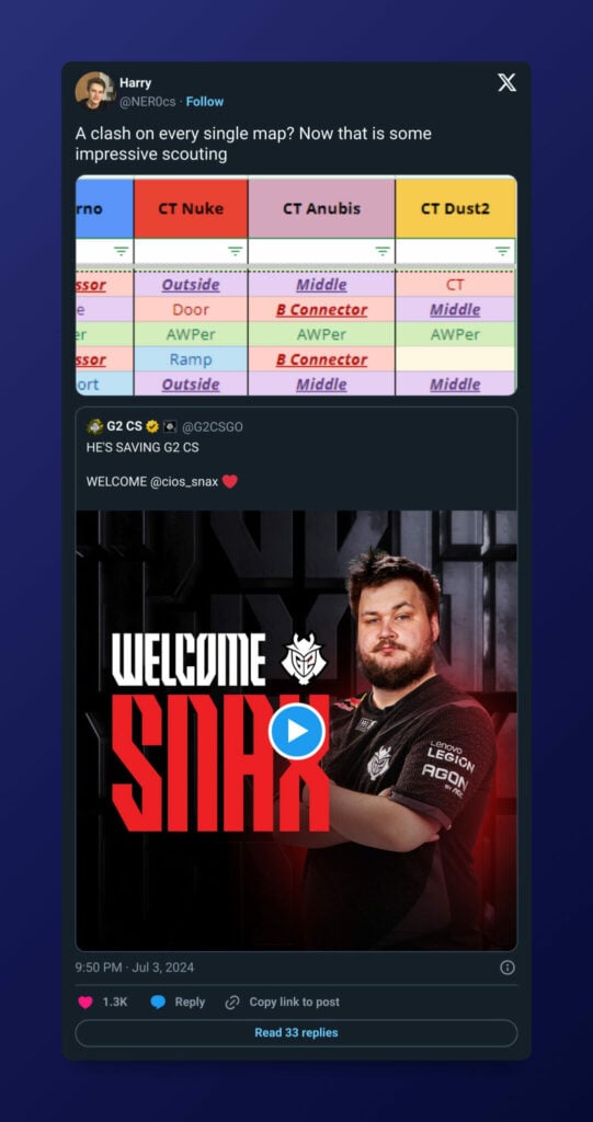 Snax’s signing alongside Mario “malbsMd” Samayoa puts G2’s role balance into question. Stats wizard and HLTV writer Harry “NER0” Richards took to social media following the announcement to share his analysis. According to his data, G2 is facing a roles clash on every single one of the seven maps in the current pool. While Snax is known to be versatile, this might become an impossible equation for him to solve alone. Expect to see Nemanja “huNter-” Kovač take a step back in his roles.