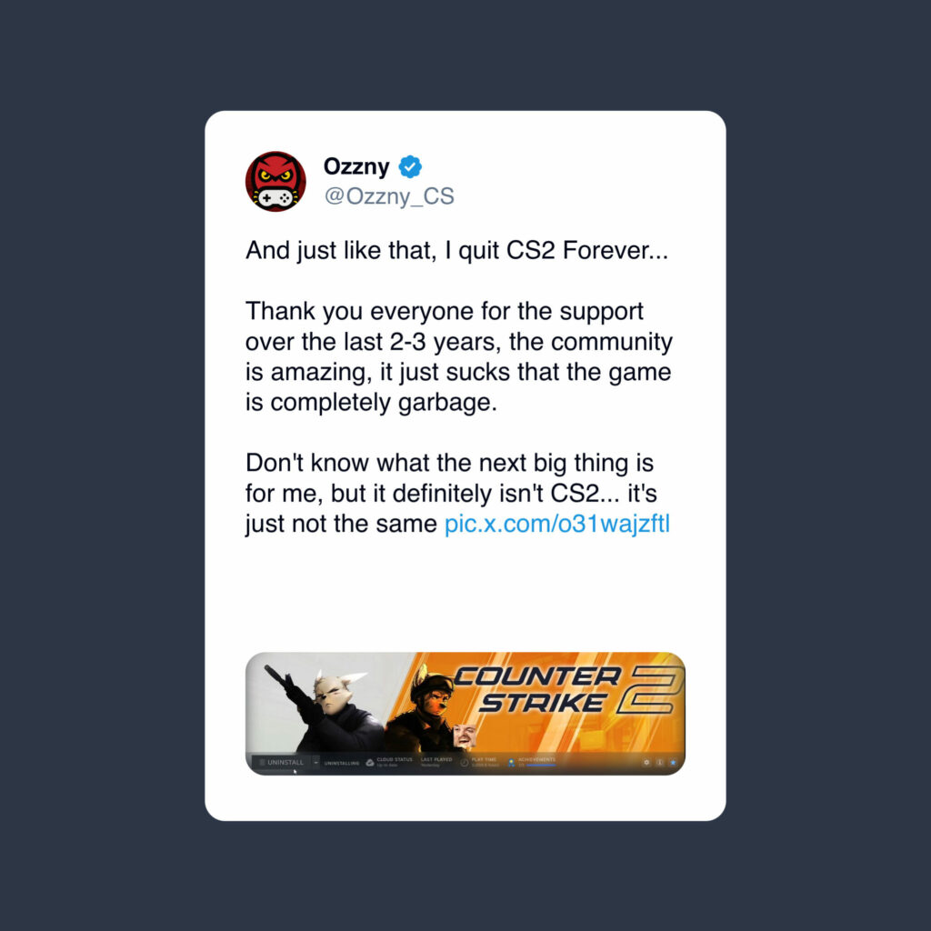 If you’ve been keeping up with your CS2 Twitter timeline, you’d have seen a new trend pop up today. Many organizations and community figures have tweeted out saying they’ve “Quit CS2 Forever”. Alongside it, an image of the game being uninstalled. So where has this copypasta emerged from, and who has actually quit CS2 forever?