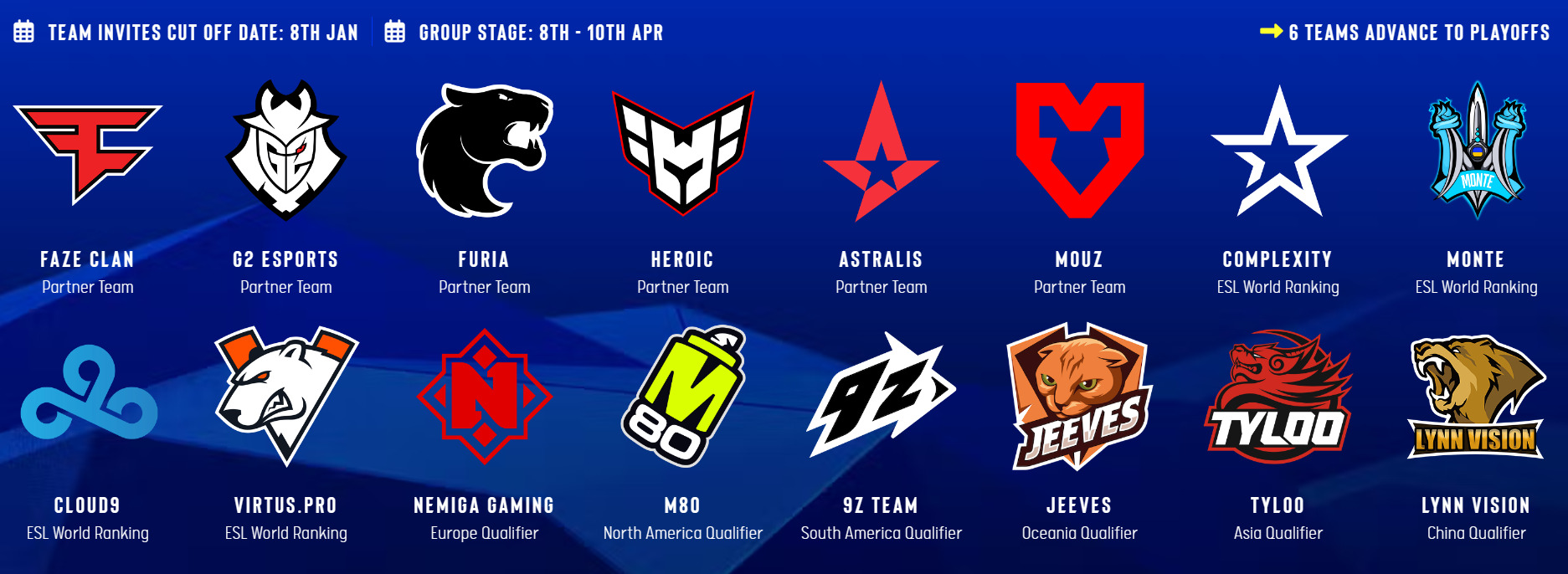 The tournament invites include six partner teams. There are also for teams that secure their place at this event in their ESL World Ranking. The remaining teams have had to qualify via the regional qualifiers from all over the world.