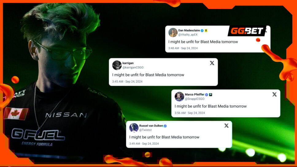 On the eve of the BLAST Premier Fall Finals media day, Dan “apEX” Madesclaire, Russel “Twistzz” Van Dulken, Finn “karrigan” Andersen, and Marco “Snappi” Pfeiffer posted identically worded messages on Twitter. In the message, they all said they ” might be unfit for Blast Media tomorrow.”