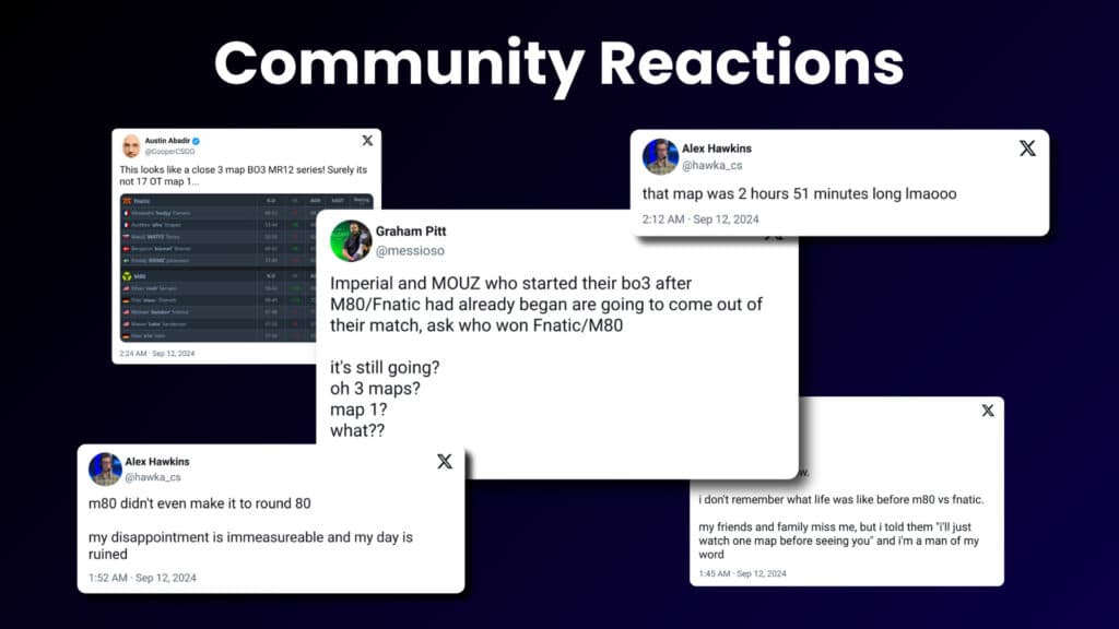 The concurrent game between MOUZ and Imperial on the other stream for ESL Pro League started off after M80 vs Fnatic. But by the time MOUZ's players emerged from their own Best-of-Three series that also featured overtime, the match on Anubis was still ongoing. By that point, the Twitter-sphere was already buzzing with prospects of a new longest CS2 map record being set. In total, the map lasted over 2.5 hours.