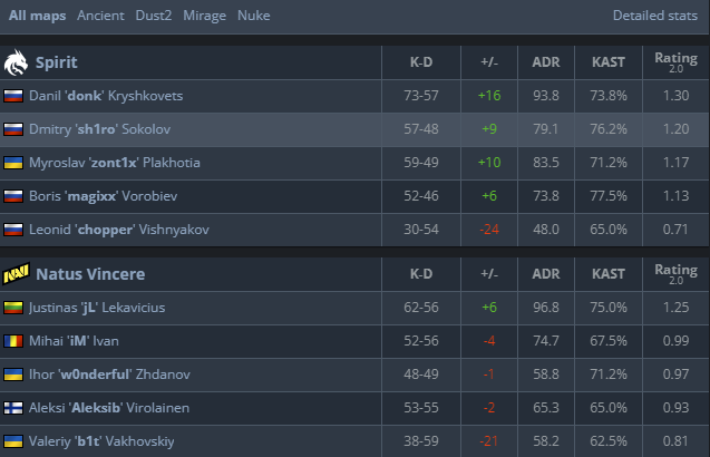 Donk and co. secured a big 10-2 advantage for the second half and even though NAVI nearly made the comeback in the end, they messed up in a round in which Spirit had pistols and conceded match point. Spirit didn’t throw away the opportunity and comfortably closed the map 13-9. Sh1ro, donk, and magixx all grabbed over 15 kills each, while only iM did the same for NAVI.
