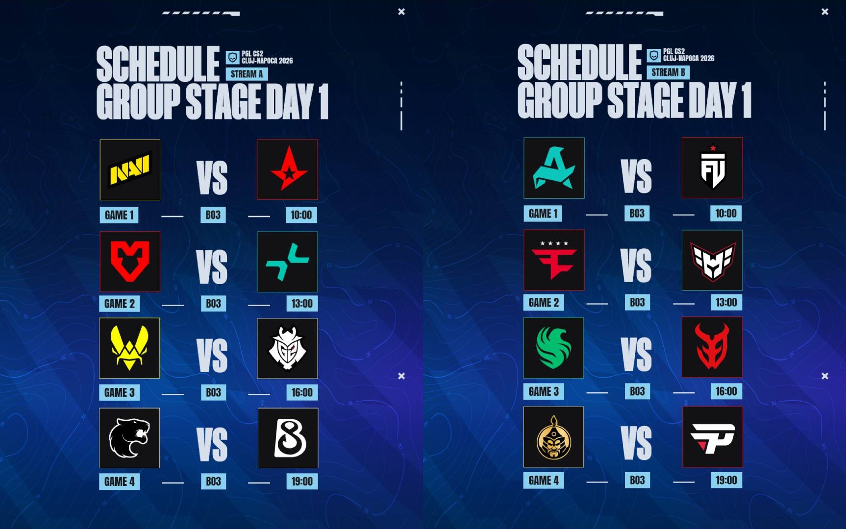 To kick off the competition, the 16 participants have quite stacked five Swiss Stage days at PGL Cluj-Napoca 2026. All rounds are best-of-three.