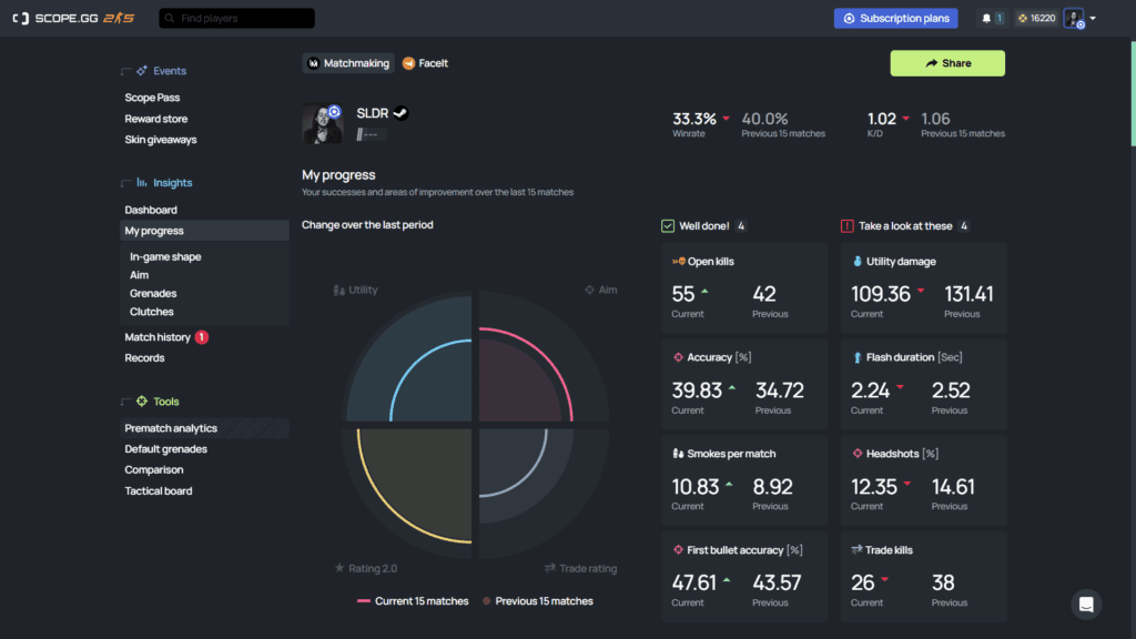 Scope.gg is a tracking tool that collects data from CS2 matches and provides users with detailed analysis. Scope.gg also records the best moments and automatically creates highlight clips.
