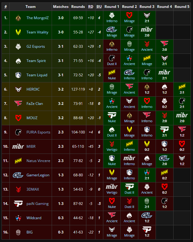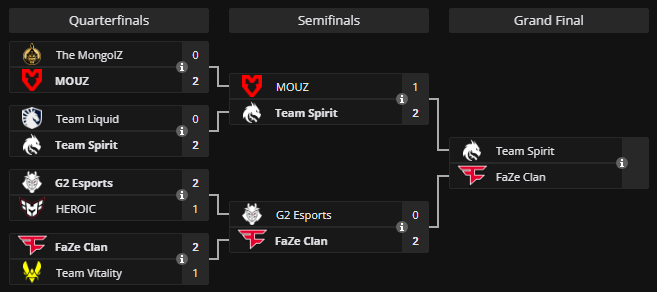 | Elimination Stage (Legends) | G2 Esports Natus Vincere Team Vitality Team Spirit MOUZ FaZe Clan HEROIC 3DMAX |