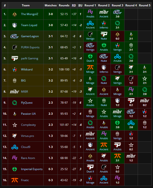 | Opening Stage (Challengers) | FURIA Virtus.pro Team Liquid Complexity BIG Fnatic The MongolZ paiN Gaming GamerLegion MIBR Cloud9 FlyQuest Passion UA Wildcard Rare Atom Imperial Esports |