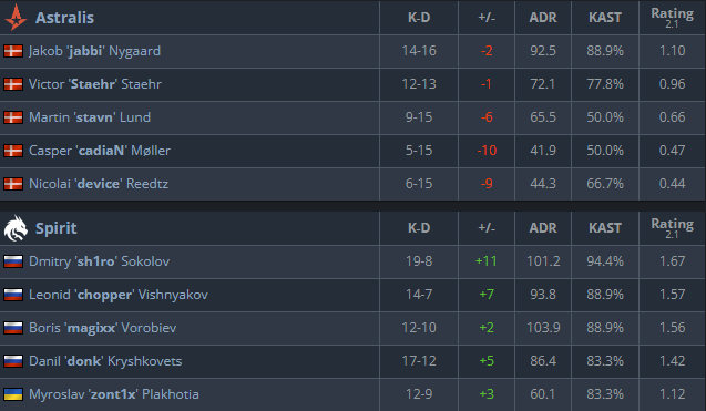 Just when the Danes were finding some success, the first half finished 7-5 in favor of Spirit and they went on to show Astralis how to play Dust 2’s T-side. The Russians won six rounds in a row with Boris “magixx” Vorobyev hitting a triple kill to close things out. The MVP of the map, though, was donk. The prodigy got 20 kills and only died 10 times.