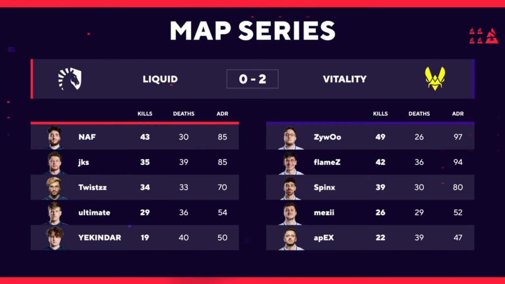 NAF finally broke the streak with a key quad kill to turn the tides for Liquid. That prompted the NA side to put together a run of their own all the way to match point. Unfortunately, they weren't able to close the map and Vitality pushed it to Overtime. Overtime saw Vitality turn up the heat massively as flameZ joined his teammates in a dominant showing to close the map out 16-12.