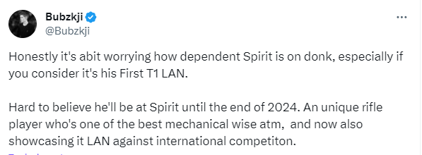 “[Honestly,] it’s [a bit] worrying how dependent Spirit is on donk,” broadcast analyst Lucas “Bubzkji” Andersen wrote on X. “Especially if you consider it’s his First T1 LAN. Hard to believe he’ll be at Spirit until the end of 2024. An unique rifle player who’s one of the best mechanical wise atm, and now also showcasing it LAN against international [competition].”