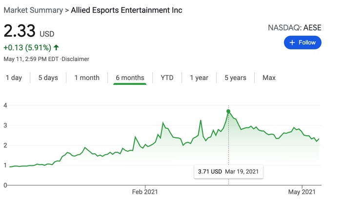 Luckily for them, they are in a developing esports niche in the US Stock market. Esports companies are slowly beginning to pick up pace in the US. Esports company Allied Esports found success, reaching a high of $3.71 USD per share in March 2021. Initially at a price of under a dollar, the Irvine based company currently sits at $2.33 USD per share.