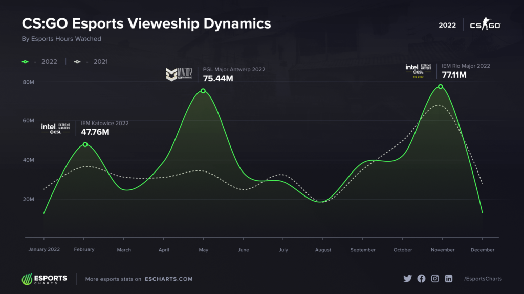 Counter-Strike put up 449.7 million hours watched last year, 8.8% more than in 2021. February, May, and November were the best months in terms of audience for CS:GO. Those months saw the top tier tournaments of the esport, such as IEM Katowice, PGL Antwerp Major, and IEM Rio Major, respectively.