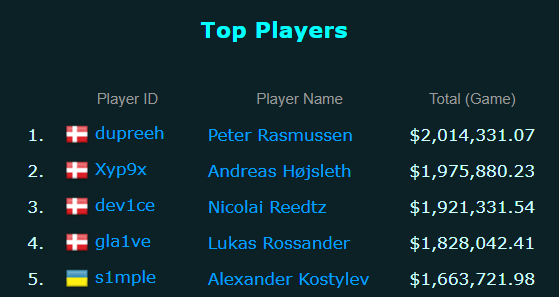 Top Five earning CS: GO players (prize money)