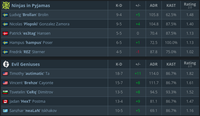 Off the bat ceRq and Brehze combined for 15 frags, pushing their team to a 6-1 lead. And the dominance continued as autimatic dominated the server with a CT side rating of 1.82. Ending the half with a 13-2 lead it looked inevitable that EG would break their record. But NIP’s come back put that into question, with the Ninjas putting together 5 rounds in a row to start their CT side.