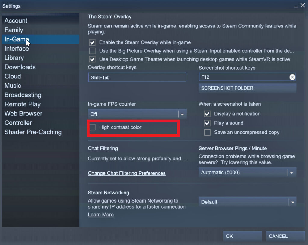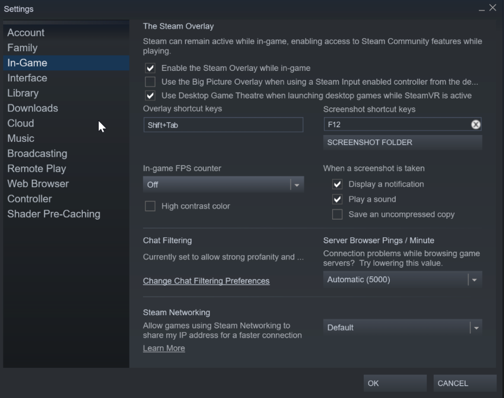 On the left sidebar, go to ‘in-game’ settings. You will see a myriad of options including the buttons for screenshots, Steam Overlay, and more.