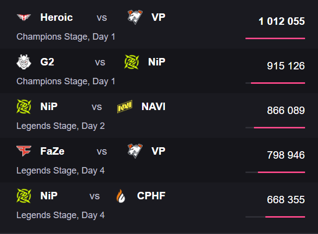 Virtus.pro and Heroic was the most-watched match while G2-NiP came in next. The next three matches feature Legends Stage match-ups: NiP vs NAVI, FaZe vs VP and NiP vs CPHF.