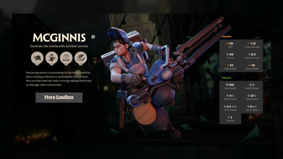 - Mini Turret: Deploy a Mini Turret that automatically shoots enemies. The turret expires after a limited time. Turrets gain 30% of McGinnis’s max health and have 60% Spirit Resist. They deal reduced damage to troopers and objectives.