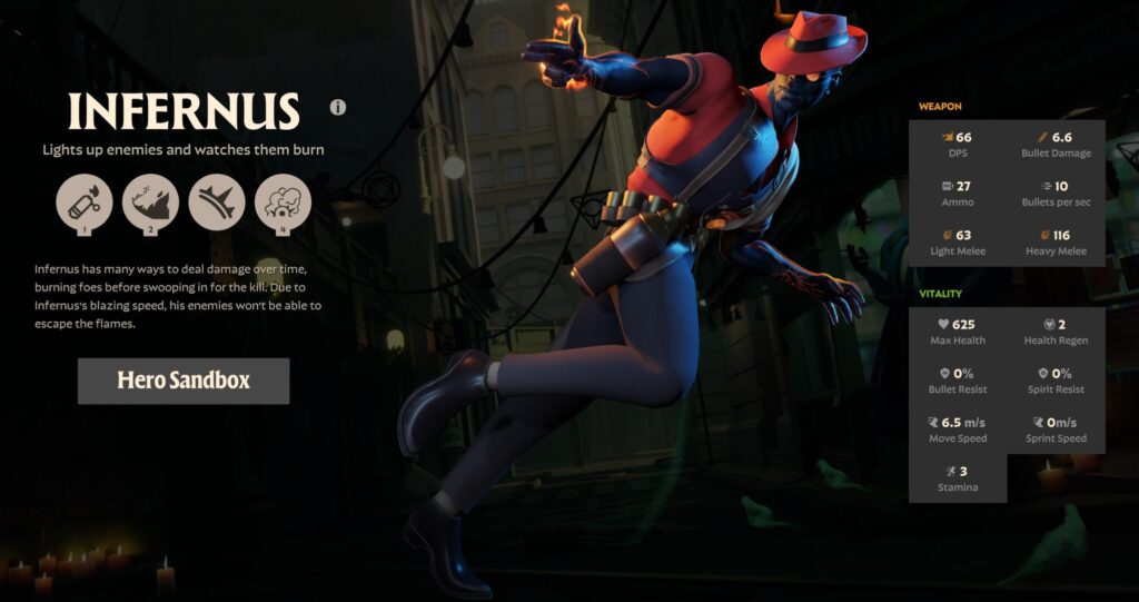 - Afterburn: Your bullets build up to apply a burning effect on enemies. Infernus’s bullets and abilities will refresh the duration.