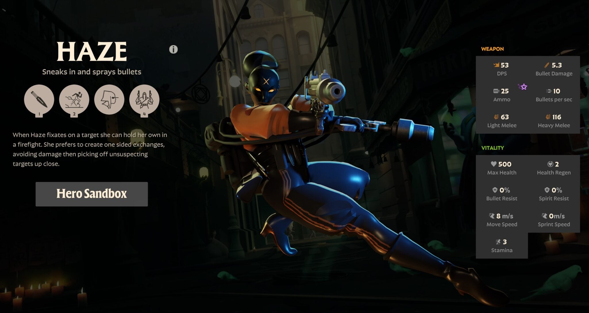 - Bullet Dance: Enter a flurry, firing your weapon at nearby enemies with perfect accuracy. During the flurry, Haze gains a fire rate bonus and will evade some of the bullets shot at her.