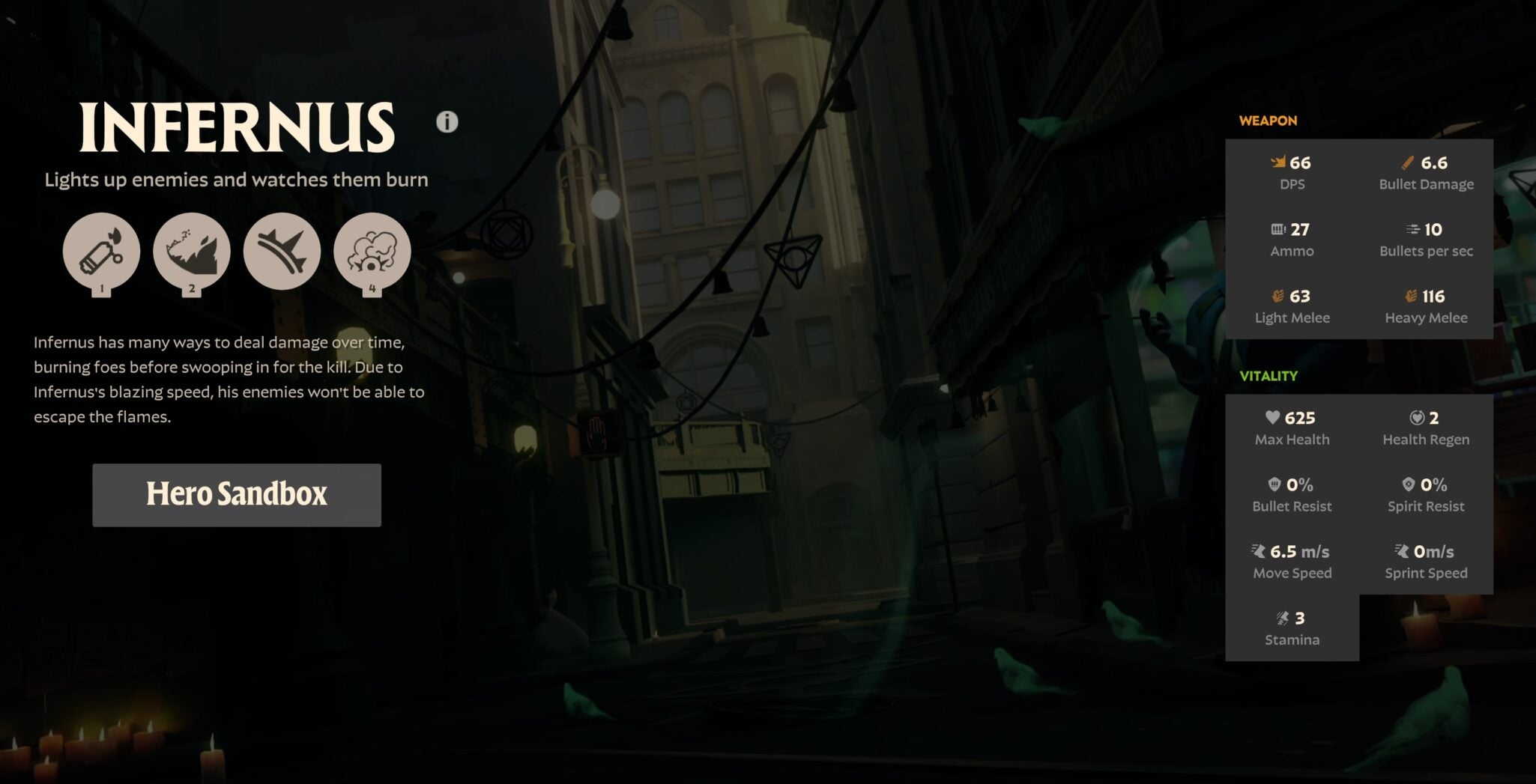 - Afterburn: Your bullets build up to apply a burning effect on enemies. Infernus’s bullets and abilities will refresh the duration.
