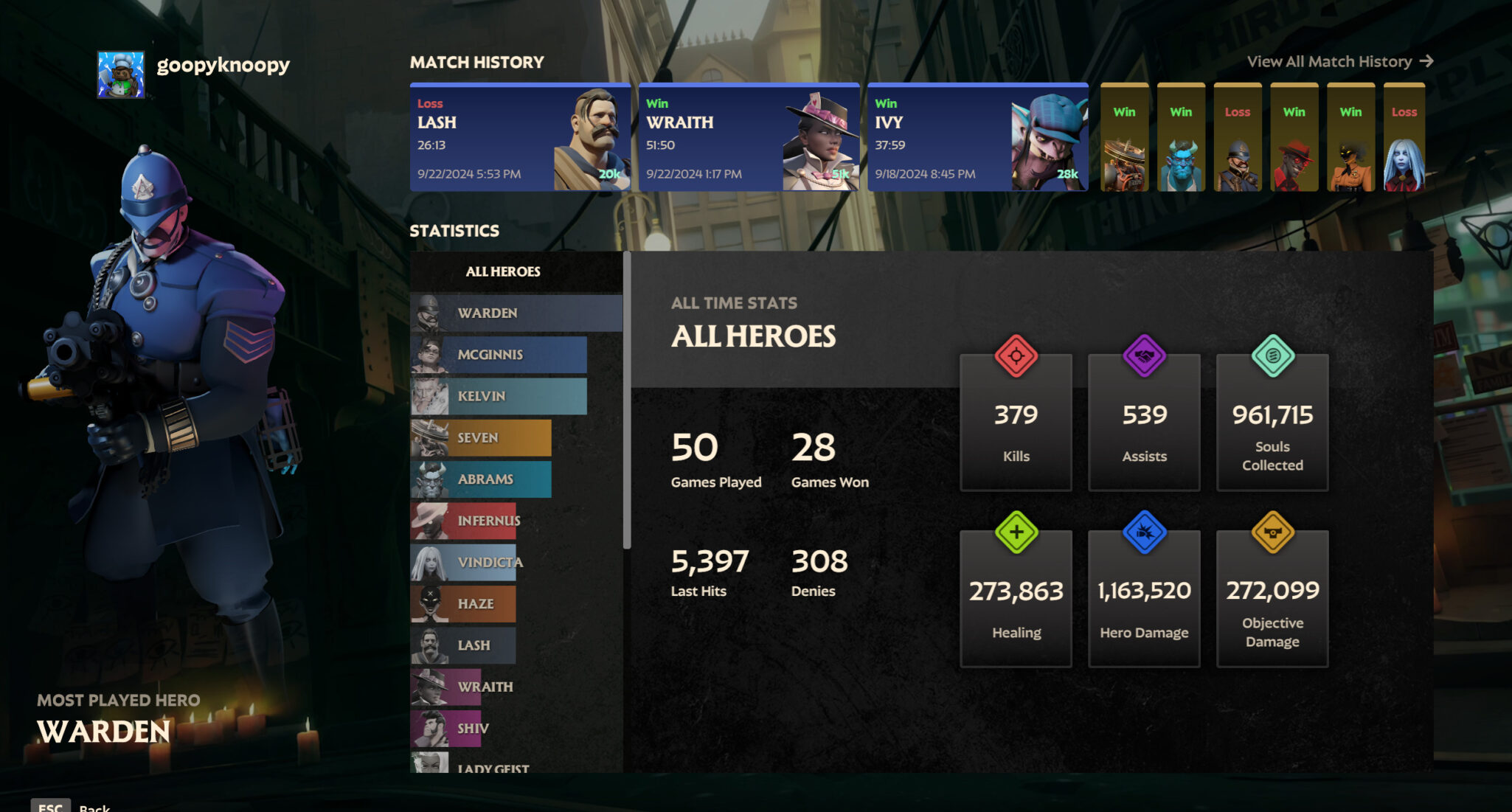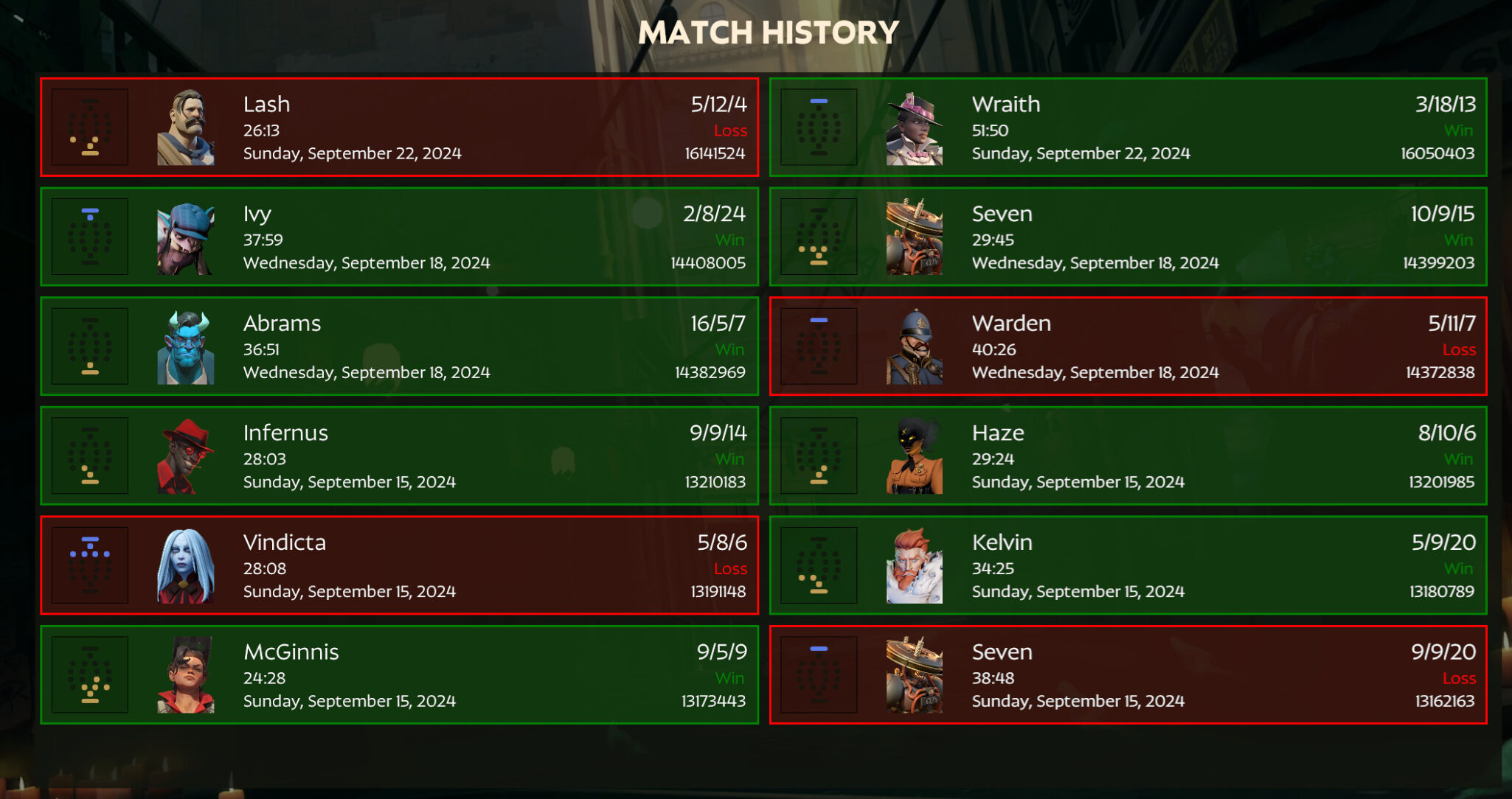 - Boot up Deadlock and navigate to your profile in the top right of the main menu screen. Here, you can see your most played heroes, basic stats, as well as your recent matches.