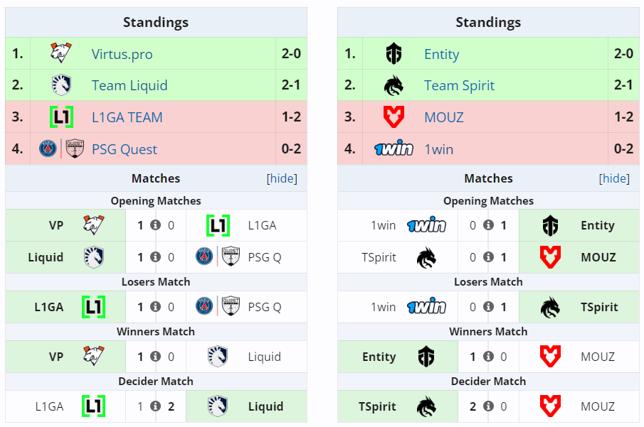 The 1win Series Dota 2 Spring is a short tournament that is not short of surprises. Team Spirit and Team Liquid are out of the running for the 1win championship after an unlikely 2-0 stomps by Virtus.pro and Entity. That said, they still have one series left in order to get a third place finish.