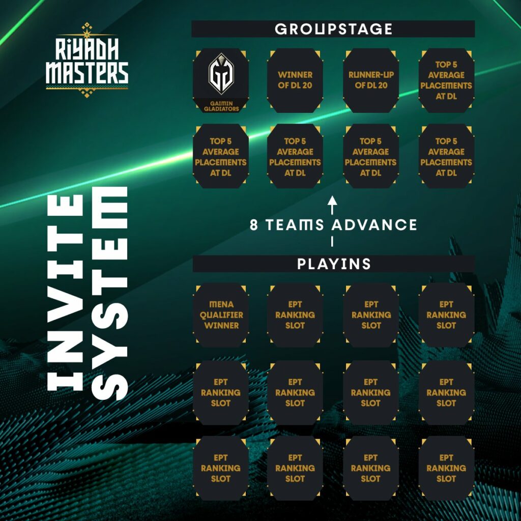 The 2023 Riyadh Masters selected twenty teams based on the criteria below. Eight teams qualify directly into the Group Stage and twelve others are invited based on the EPT Ranking System. Each region have at least one representative and there is also one slot for the MENA (Middle East and North Africa) region.
