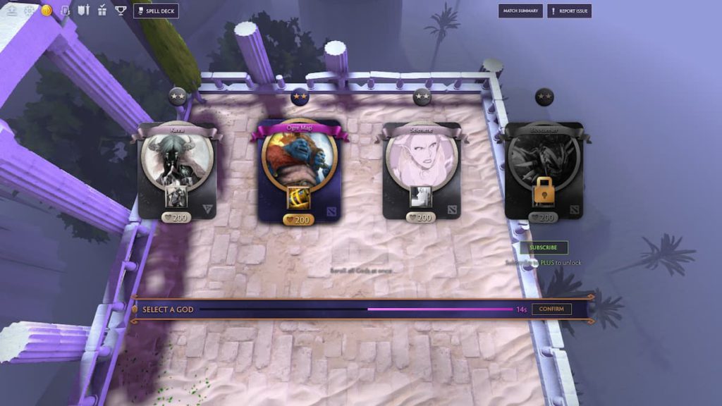 These kinds of stomps and revelations would be demoralizing if not for how clean and polished the game looked. And the incredible small details. There’s so many touches with this game mode that make it a joy to play. The tiny icons next to each God to tell you which game they’re from. Or the fact the spells will tell you exactly how they’re different to their in-game Dota counterparts if you hover over them. Of the fact the game is so self aware that the cosmetics it offers are just hats that sit on static avatars. Not to mention how remarkably functional the shop and all these features are.
