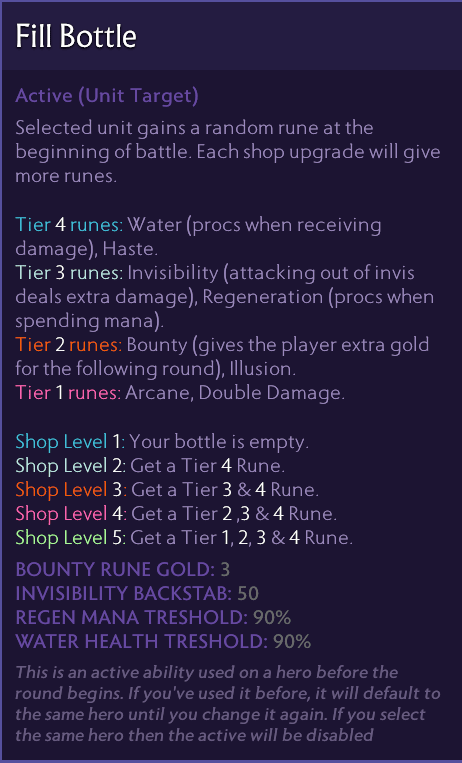 In short, the Rune God basically buffs a single target with different runes. And the type of rune depends on your shop level. The mechanic is similar to the base God Aghanim, that randomly upgrades your spells depending on what level shop you have. There are 4 tiers of runes, and each shop level grants more and more runes for the target. Yes, that means you can have multiple runes active on one hero. This mechanic activates on every battle. Meaning that the tides of Ability Arena can turn pretty quickly depending on what runes you have. So, first lets dive into each rune and what they offer.