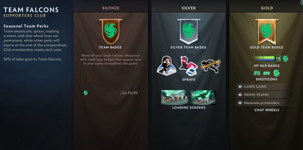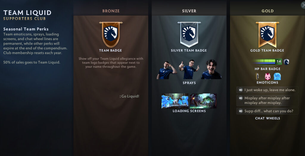 Valve has once again brought back the Team Supporters Club in this Compendium. It’s important to note that the voice lines in the Supporters Club cannot be purchased separately. You must buy the corresponding team’s Gold Tier Supporters Club to unlock these exclusive voice lines. Notably, only Team Liquid’s voice lines are entirely in English, while other teams’ bundles include a mix of languages. This gives each team’s voice lines a unique character and regional flavor.