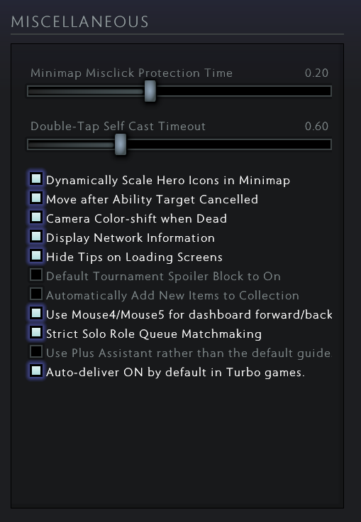 Below the interface settings are a bunch of settings that don’t really affect your gameplay much. However, there is one setting, ‘Unit Query Overrides Hero Control console’ that has a significant visual display difference. If unticked, hero and unit selections in-game will show in a separate box instead of the normal hero HUD. However, this will block a certain of the map, which is why it is advisable to select this setting.