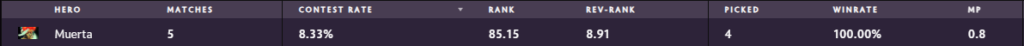 Muerta hasn’t really changed since her dominant streak a couple patches ago, where she was the go-to carry. However despite her falling out of the meta, she still deals insane amounts of damage and control in team fights with her kit. And it shows, with 4 total picks and a 100% win rate. She’s been both seen as a carry and a support, by Gaimin Gladiators and LGD to amazing extent.