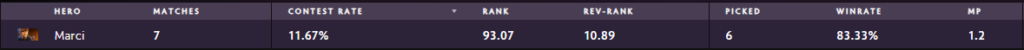 With 6 total picks, Marci has put in the work at Betboom Dacha for her team. She’s exclusively been played as a support, but don’t let that fool you. As she sits with a 83% win rate, which is one of the highest win rates for heroes with more than five matches. She’s been used predominantly alongside heavy initiation or frontline heroes like Mars or Centaur as a follow up initiator.