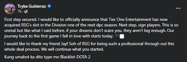 CEO of Tier One Entertainment, Tryke Gutierrez announced their acquisition of RSG’s slot in the upper division of SEA DPC. “First step secured. I would like to officially announce that Tier One Entertainment has now acquired RSG’s slot in Division one of the next DPC season. Next step, sign players.”