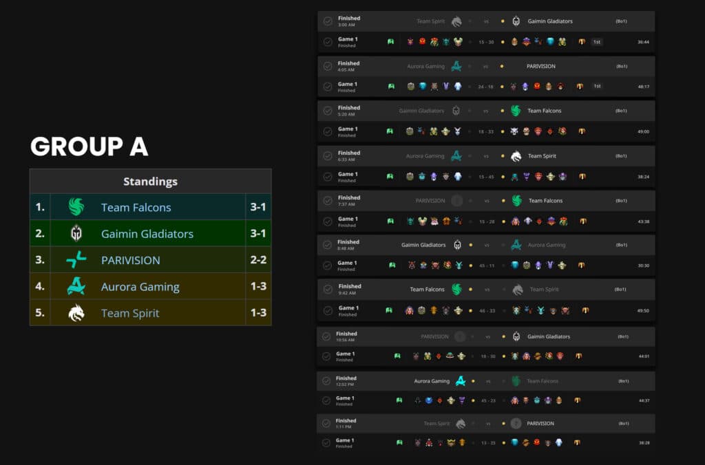 For Group A, our favorite matches are PARIVISION vs. Spirit (Satanic faces his old team once again), Falcons vs. Gaimin Gladiators (redemption time for the MENA team), and Aurora vs Spirit (Offlane TORONTOTOKYO facing Collapse? PLEASE!).