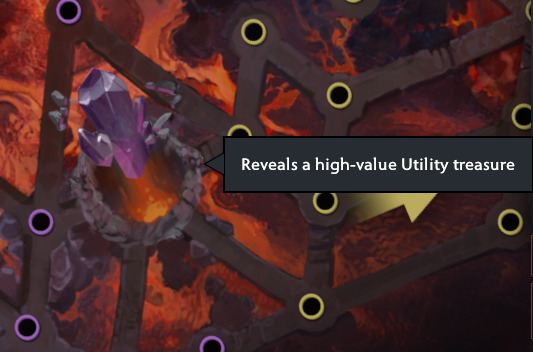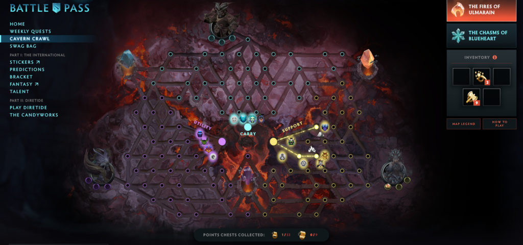 The massive Cavern Crawl map is divided into three sections: Support, Carry, and Utility. At the end of each path, stands a reward. If you want to claim a specific hero set or treasure, set off on a path that can lead to the reward. Or you can randomly go for any quests you prefer to complete.