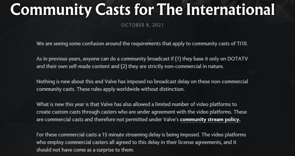 Therefore, a 15 minute on-stream delay will be mandatory for all commercial casts. Valve also mentioned that this rule has been agreed by the video platforms who employ commercial casters for custom casts, and that they should not be surprised by this.