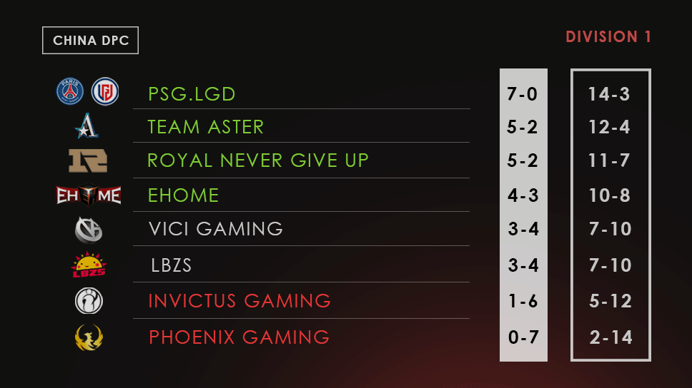 The heavily competitive Chinese scene sees none other than PSG.LGD reigning supreme, bringing another undefeated performance in the DPC. Former CN kings, Team Aster now sit at 2nd place after winning a revenge tiebreaker against Royal Never Give Up. A surprising turn this season is definitely Invictus Gaming’s shocking relegation after a poor run.