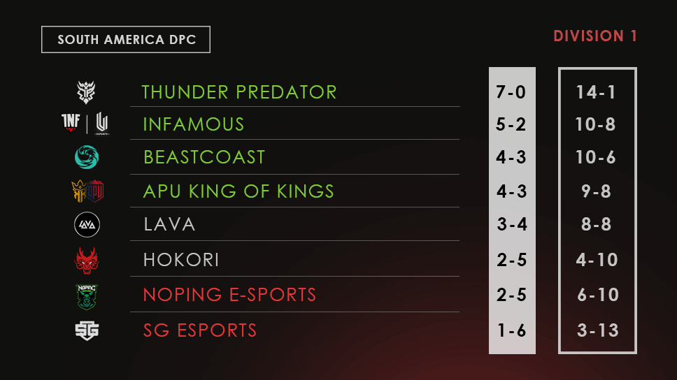 South America sees familiar names on top, but also at the bottom. Thunder Predator swept through the league with an undefeated streak to claim the 1st spot. Many would have predicted TI team, beastcoast to achieve a top placing, however, it lost 3 series, dropping the team at 3rd spot just behind Infamous. SA will also see TI and Major attendees, NoPing e-sports, and SG esports exit the upper-division following a disappointing run.